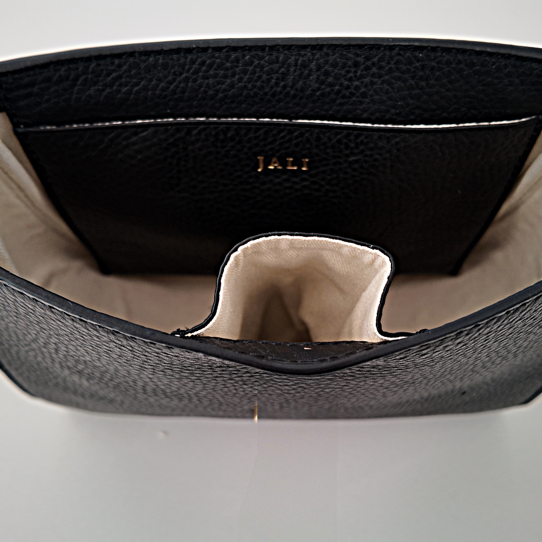 Inside view of Cleopatra Bag in Black by Jali, showing spacious 100% cotton biodegradable lining and gold-plated hardware – Australian luxury leather handbag
